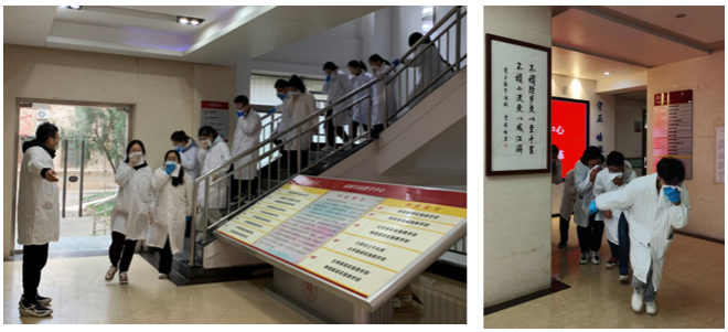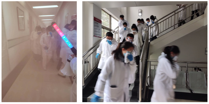 现场模拟教学七楼5层西侧化学实验室发生“火情”,现场浓烟滚滚,火势迅速向各楼层蔓延,并有人员受伤,情况危急。疏散引导组使用“闪光棒”指挥楼内师生用湿毛巾捂住口鼻,低头弯腰呈一路纵队有序逃离;疏散检查组逐层排查室内人员,清点人员数量,确保无滞留人员;报警组模拟拨打火警电话,汇报火情并进行事故上报,寻求救援;应急救助组迅速将“伤员”救援至开阔地带,在“黄金四分钟”内为伤者实施有效心肺复苏,为AED(自动体外除颤器)和120救护车的到来争取时间,提高抢救效率。