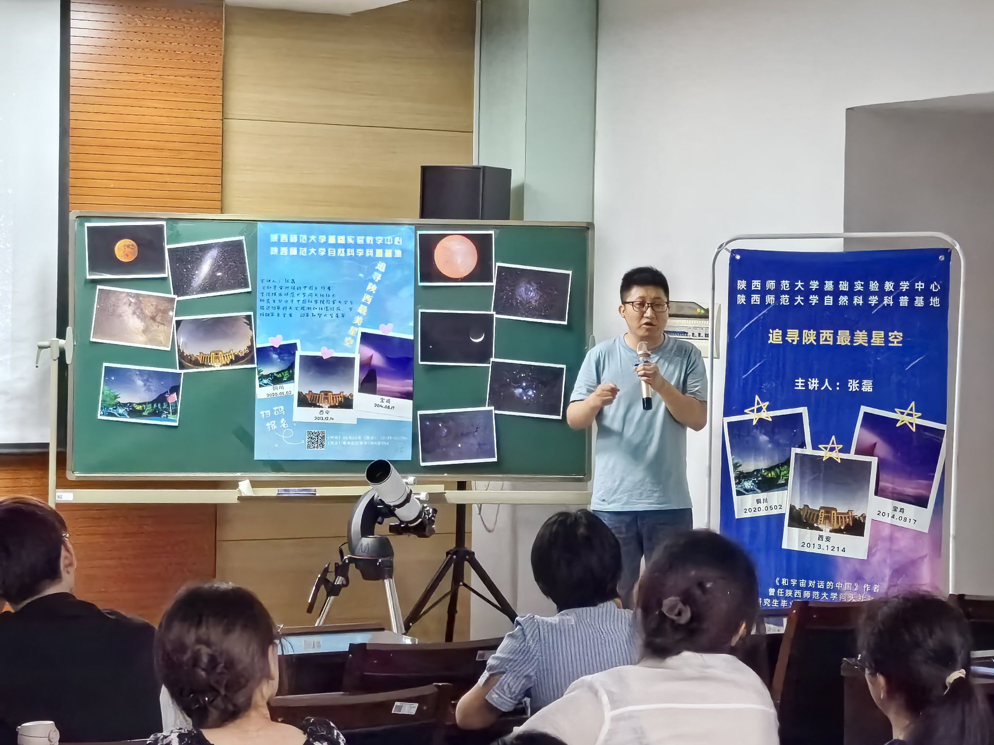 为了大力弘扬科学精神,普及科学知识,提升学生科学素养,培养创新型时代新人,2024年6月16日晚,由成人色情 (成人色情 自然科学科普基地)举办的《追寻陕西最美星空》科普讲座在教学7楼604会议室顺利举行。本次讲座向校内外公众开放,吸引了众多师生、天文爱好者以及中小学生和他们的家庭。